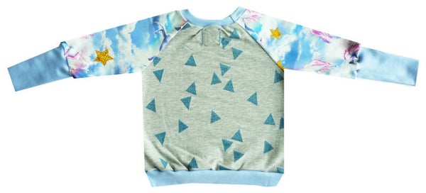 De voorkant is gemaakt uit lichtblauwe joggingstof, de achterkant heeft een grijze joggingstof bedrukt met blauwe driehoekjes waarin een glittertje zit. De mouwen hebben tricotstof voorzien van éénhoorns en gouden sterretjes.